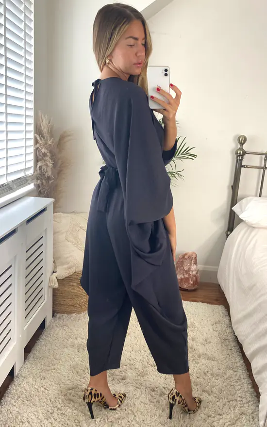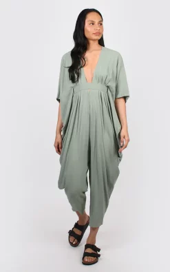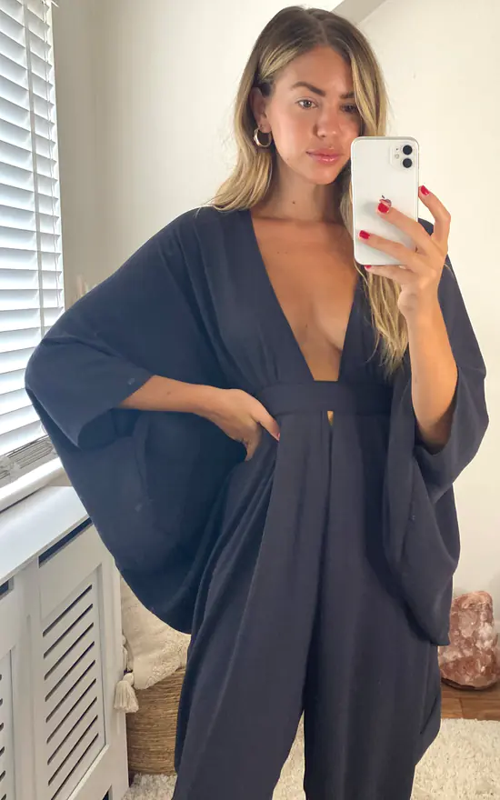 The Mina catsuit is a 3/4 sleeve catsuit that has belt that threads through from the front to underneath and then ties around the body, pulling the waist in for a flattering fit. The fabric has a cotton/linen feel to it.