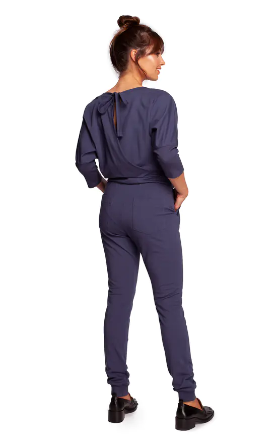 Choose one piece instead of two and save time in styling your everyday look. This practical one-piece jumpsuit offers comfort because it was made of cotton-based knit fabric, and trendy looks with its wrap back design and a tie detail on the neck.