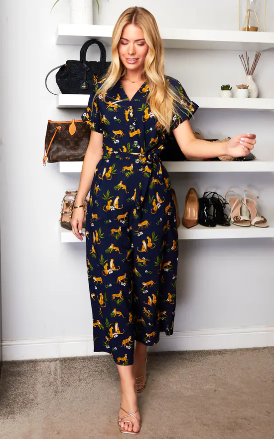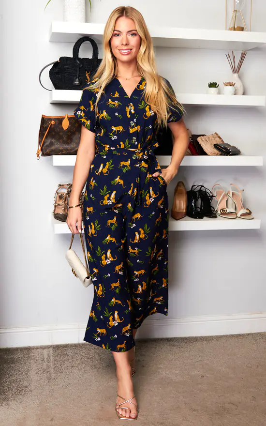 Covered in a navy Cheetah print, designed exclusively in house for Yumi from recycled fabric, in the must have jumpsuit shape. This all-in-one comes in a relaxed cut with a waist cinching tie belt, short sleeves and culotte style trousers
